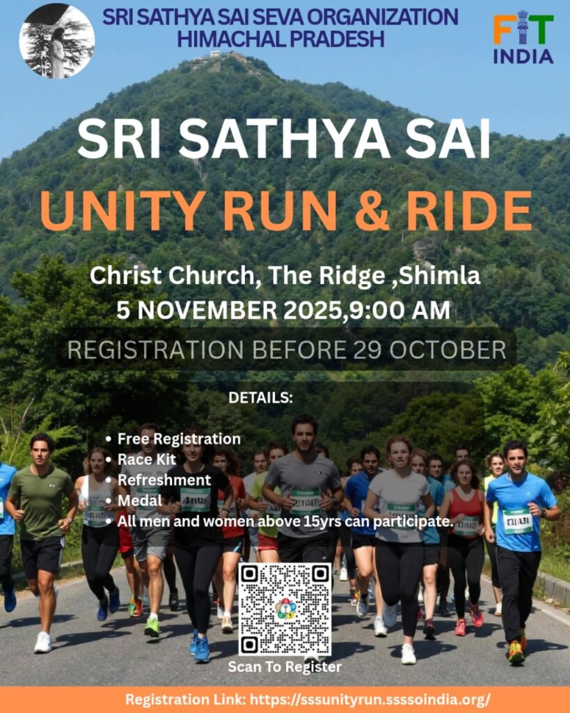 शिमला:  प्रेम, शांति और एकता का संदेश लेकर श्री सत्य साई यूनिटी रन का आयोजन 5 नवंबर को शिमला के ऐतिहासिक रिज मैदान में किया जाएगा। यह आयोजन श्री सत्य साई सेवा संगठन, हिमाचल प्रदेश द्वारा भगवान श्री सत्य साई बाबा के 100वें जन्म शताब्दी वर्ष के उपलक्ष्य में किया जा रहा है।