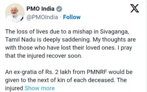“तमिलनाडु के शिवगंगा में हुई एक दुर्घटना में हुई लोगों की मृत्यु अत्यंत दुखद है। मेरी संवेदनाएं उन लोगों के साथ हैं जिन्होंने अपने प्रियजनों को खो दिया है। मैं प्रार्थना करता हूं कि घायल शीघ्र स्वस्थ हों।