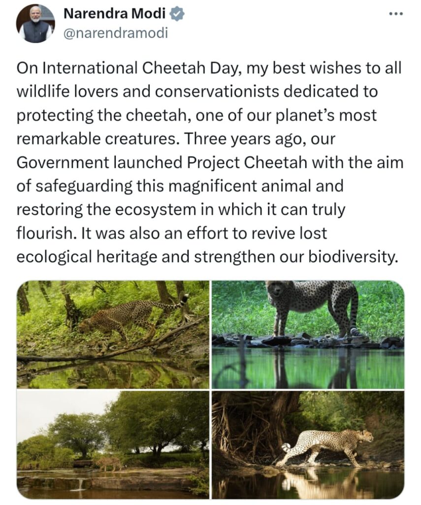 प्रधानमंत्री नरेन्‍द्र मोदी ने अंतर्राष्ट्रीय चीता दिवस पर सभी वन्यजीव प्रेमियों को बधाई दी