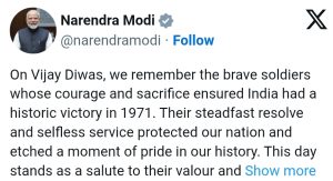 “विजय दिवस पर हम उन वीर सैनिकों को याद करते हैं जिनके साहस और बलिदान ने 1971 में भारत को ऐतिहासिक जीत दिलाई। उनके दृढ़ संकल्प और निस्वार्थ सेवा ने हमारे राष्ट्र की रक्षा की और हमारे इतिहास में गौरव का एक पल अंकित किया। यह दिन उनके बेमिसाल साहस की याद दिलाता है। उनकी वीरता देश की पीढ़ियों को प्रेरित करती रहेगी।”