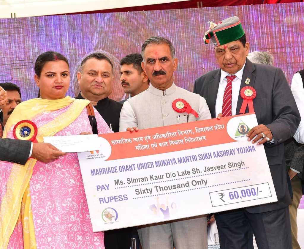 कार्यक्रम में मुख्यमंत्री सुख आश्रय योजना के तहत शिखा, सिमरन कौर, शिया तथा प्रेम लता को विवाह अनुदान के अन्तर्गत 60-60 हजार रुपये, महबूब हसन तथा रवि को मुख्यमंत्री सुख आश्रय योजना में दी जाने वाली मकान निर्माण के लिए दूसरी किश्त के रूप में एक-एक लाख रुपये दिये। मुख्यमंत्री शगुन योजना के अन्तर्गत संतोष देवी, शीला देवी तथा नीमो देवी को 31-31 हजार रुपये, विधवा पुनर्विवाह योजना के तहत नसिफा, नितेश तथा विधा देवी को दो-दो लाख रुपये, मुख्यमंत्री कन्यादान योजना के तहत बबीता, सुनीता देवी तथा अनीता देवी को 51-51 हजार रुपये प्रदान किये गए।