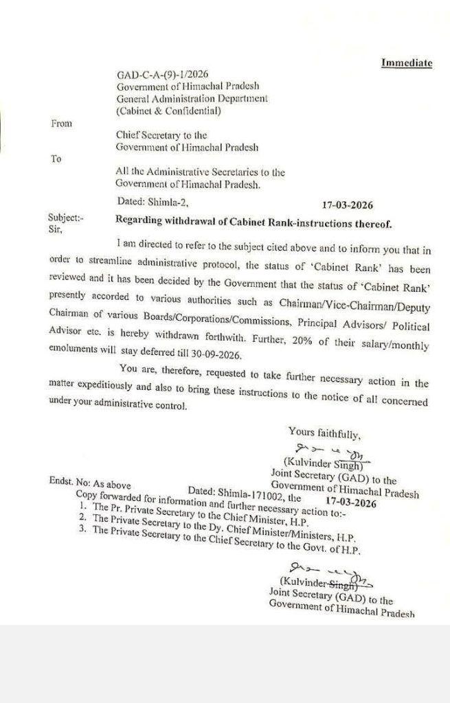 शिमला। मुख्यमंत्री ठाकुर सुखविन्द्र सिंह सुक्खू का बड़ा फैसला, सभी कैबिनेट रैंक खत्म